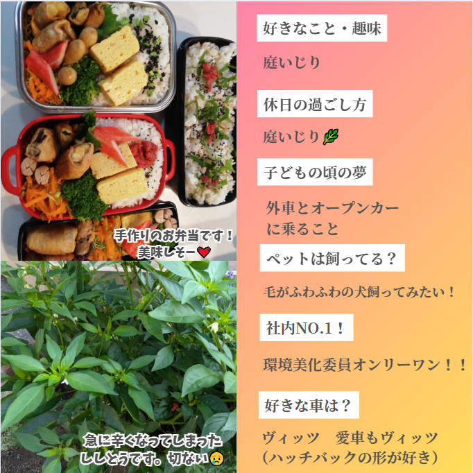 今回のご紹介は… CCSの 藤澤貴子さん(フジフジ) です🌸 休日は庭いじりでリフレッシュ!🌿 🏆「環境美化委員No.1!」の名にふさわしく、社内でもきれい好きで頼れる存在👏 子どもの頃の夢は、外車&オープンカーに乗ること🚀✨ 好きな車も、そして愛車も ヴィッツ!🚗 ハッチバックのフォルムに一目惚れなんだそうです💓 いつかはふわふわのワンちゃんと暮らしてみたい…そんな優しい一面も♪🐶 そして仕事の原動力は… 👶キッズコーナーから聞こえるお子さまたちの元気な声! 「にぎやかな声に、いつも励まされています😊」と語ってくれました!