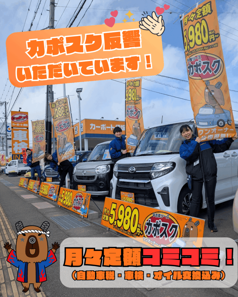 皆様こんにちは! SNS担当の土屋です🙋♀️🚗 本日は、皆様からたくさんの反響をいただいている**【カーポートサブスクリプション】 通称『カポスク』**について改めてご紹介させていただきます!✨ 🚗 カポスクってなに? カポスクとは、ずばり**「中古車のサブスクリプション」**のこと! 車両価格はもちろん、お車を維持するのにかかる費用がぜ〜んぶ月額にコミコミで乗れる、 新しいクルマの持ち方です👛💡 👇 こんな方にイチオシです! 「車は欲しいけど、税金や車検など急な出費が煩わしい…」 「サブスクで乗りたいけど、新車だと高くて手が出ない…」 「初めての車で維持費の相場が分からないから、全部コミコミで乗りたい!」 💡 カポスクの3つのおすすめポイント 1️⃣ 維持費がコミコミで安心! 登録にかかる初期費用をはじめ、車検費用・オイル交換代・毎年の自動車税まで、 すべて月額料金に含まれています✨ 出費がフラットになるので家計管理もラクラクです! 2️⃣ 1年単位で契約期間が選べる! ご契約年数は1年単位でお選びいただけます🗓️「転勤の間だけ」「数年だけ乗りたい」といった、 短期間でお車を持ちたい方にもぴったりです! (※お選びいただける期間は最長7年間となります) 3️⃣ 厳選された良質なお車のみ! カポスクでお選びいただける中古車は、**「修復歴なし」「ワンオーナー車」 「自社でメンテナンスを行っていた車」**など、当社が厳選した良質なお車ばかり!中古車でも、 乗り出しから安心してお乗りいただけます🍀 初めてお車をご購入される方も、お車を新しくされる方も、 ぜひ『カポスク』で賢く・お得に、安心のカーライフを始めませんか?🚗💨 気になるお車や料金のお見積りなど、お気軽にご相談、お問い合わせください! 皆様のご来店、心よりお待ちしております!