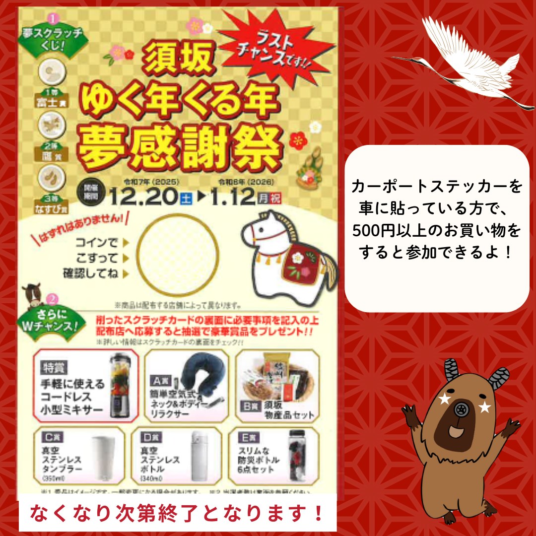 皆様こんにちは! SNS担当の伊藤です😊 📣【須坂市 ゆく年くる年の夢感謝祭】開催中! 12月20日〜来年1月12日まで 夢スクラッチくじキャンペーンを実施しております✨ 🚗カーポートステッカーをお車に貼っていただいている方で 🛍️500円以上のお買い物をされたお客様に スクラッチくじ付きハガキをお配りしています! 🎁はずれなし! 必ず景品が当たりますので、ぜひお気軽にご来店ください♪ さらに… 📮ハガキ裏面に「ご住所・お名前」などをご記入いただくと 豪華賞品が当たるチャンスもあります✨ ぜひご記入をお願いいたします! 📅【年末年始休業】 12月29日〜1月6日までお休みとなります。 ※キャンペーンは ハガキがなくなり次第終了となりますので、 お早めにご参加ください🙇♀️ 皆様のご来店をお待ちしております!