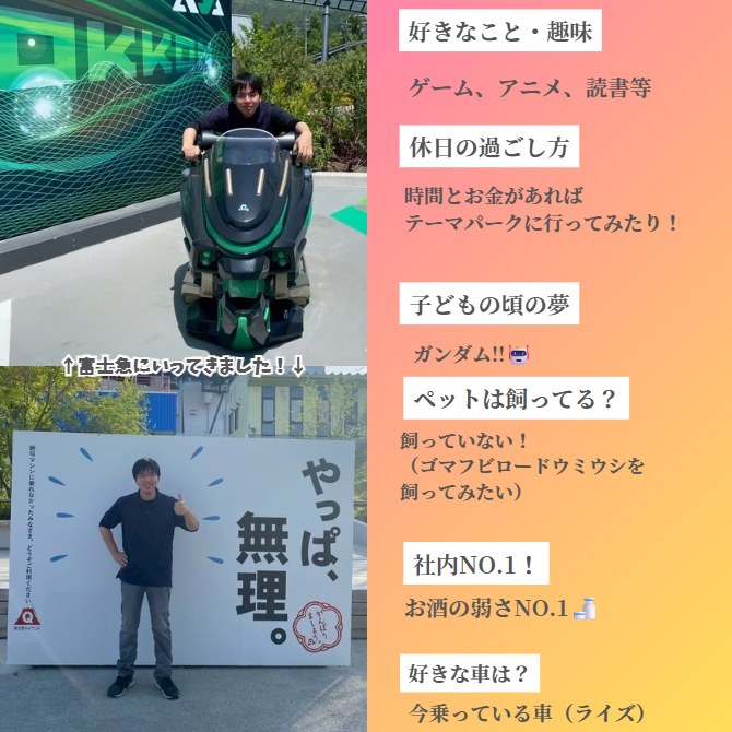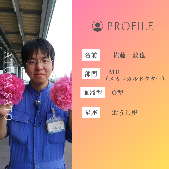 🚗🌼【スタッフ紹介 No.10】🌼🚗 今回紹介するのは、MD(メカニカルドクター)の 佐藤さん 🙌 ゲームやアニメ、読書などが好きで、休みの日は自分の時間をゆっくり楽しんでいることが多い佐藤さん🎮📚 時間とお金に余裕があると、テーマパークに行って楽しんでいるみたいです🎢✨ ちなみにお酒はあまり強くないらしく、お酒の弱さNo.1とのこと🍶😂 飲みの場ではちょっとレアな姿が見られるかもしれません。 いつかは「ゴマフビロードウミウシ」を飼ってみたいそうです。 なかなか聞かないチョイスで、私たちもちょっと気になっています…!