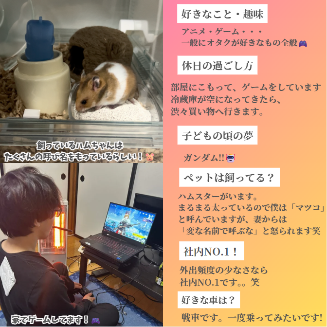 今回紹介するのは、MD(メカニカルドクター)の 石塚さん 🙌 アニメにゲームに…いわゆる“オタクが好きなもの全般”が大好物な石塚さん🎮📺 休みの日は基本おうちスタイルで、気づいたら一日ゲームしてることもあるそうです😂 冷蔵庫が空になってきたら、ちょっと渋々スーパーへ…っていうのもなんだか想像できます笑 外出頻度の少なさなら社内No.1かもしれません🤣 おうちではハムスターを飼っていて、 まるまる太ってるから「マツコ」って呼んでるらしいんですが… 奥さまからはちゃんと怒られてるそうです🐹😂